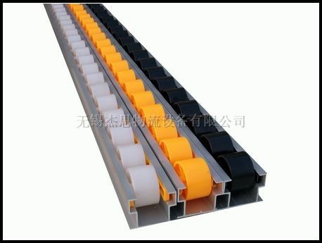 铝合金流利条骨架是采用优质高强度铝合金挤压型材,滚轮等配件由工程塑料ABS或PS改性后注塑而成,颜色有黄、蓝、黑、灰、白色等。产品广泛应用于仓储设备领域,具有高强度自润滑耐压(每轴承重可达10kg)、抗冲击、寿命长等优点,有效地提高了仓储及分拣效率。